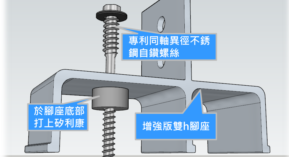 矽利康施打完成後,因立柱固定於雙h腳座鎖附點的另一側,可由此觀察自鑽螺絲上的矽利康施打有無確實。