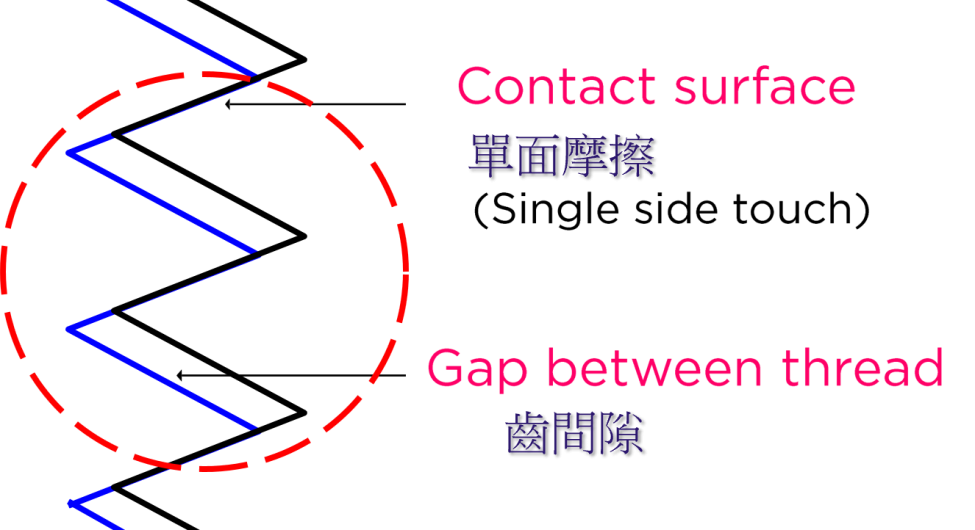 螺絲鎖緊後形成單面摩擦,螺絲與螺帽間產生齒間隙,