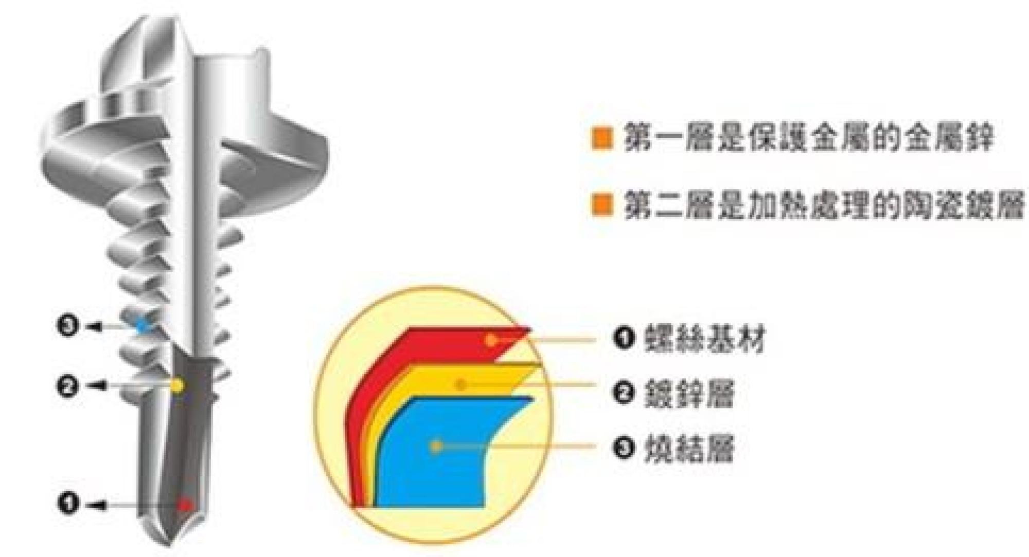 2.在不銹鋼螺釘與表層陶瓷膜之間給予2µ厚度的鍍鋅層,在貫穿攻入完成鎖固後,在內部的斷面金屬與螺釘接觸點,運用電化學原理讓Zn成為陽極持續釋放出電子給予陰極的Fe,完整的防護被鎖固的金屬免淤發生腐蝕。