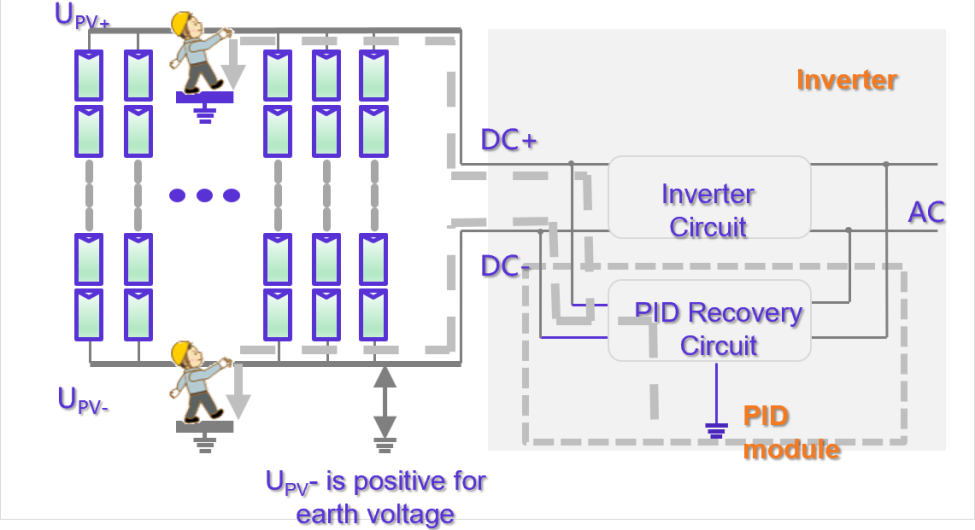 集成PID修復功能模塊,夜間通過PV-對地電壓高於0V